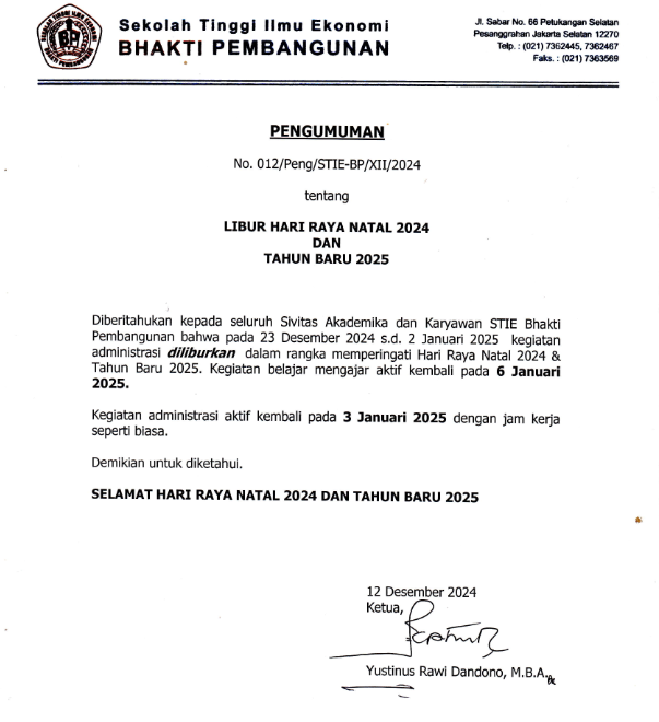 PENGUMUMAN LIBUR NATAL & TAHUN BARU ✨🎆 Diberitahukan kepada seluruh Sivitas Akademika dan Karyawan STIE Bhakti Pembangunan, libur Hari Raya...