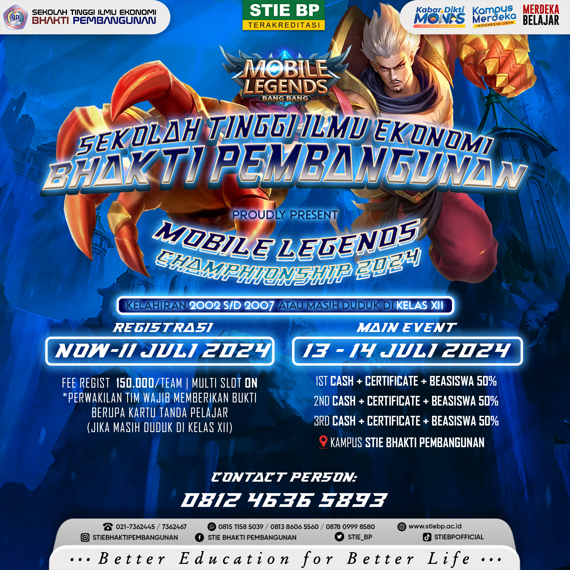 Pendaftaran sudah dibuka hingga 11 Juli 2024! Siapkan tim kalian dan tunjukkan skill terbaikmu pada turnamen offline yang akan dilaksanakan pada 13-14 Juli 2024 di kampus STIE Bhakti Pembangunan.